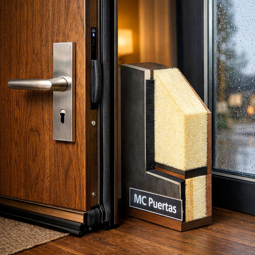Puerta de entrada de nogal con detalles de aislamiento, muestra cómo "que puertas de entrada ofrecen el mejor aislamiento termico y acustico".